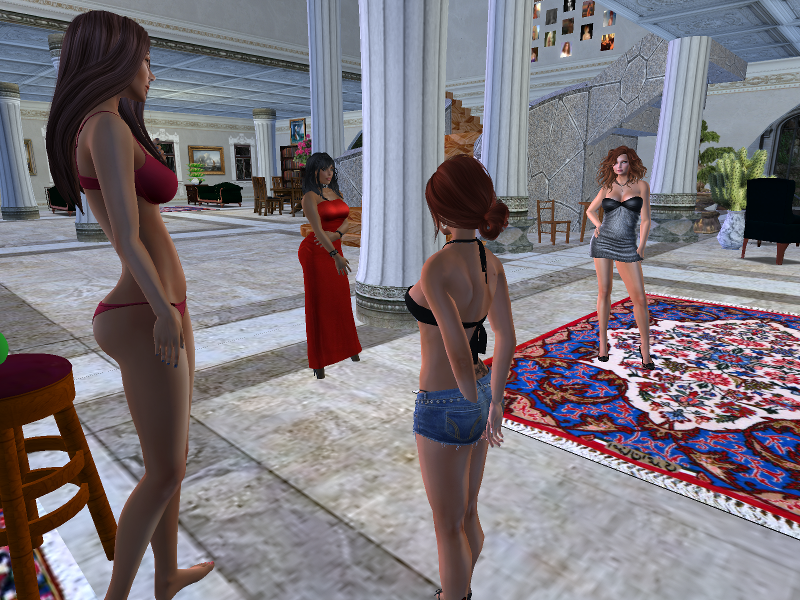 Not turning a hair, Alma and I decided to visit and meet the autochthons who appear to be quite speechless. We finally resolved to jump in the hot tub set in the middle of one of the large halls of the mansion. To my surprise, Alma stripped naked! Actually she is the bold one, not me. I giggled and plunged myself into the warm water … how relaxing and strange. Being in a stranger house, enjoying a bath in an open room where everybody can arrive. Such craziness can only happen in SecondLife. I and Alma chit chatted a big part of the night … we only have been “disturbed” one time by a man … who fell in the tub … and worst of all for such a place: he apologized and fled.