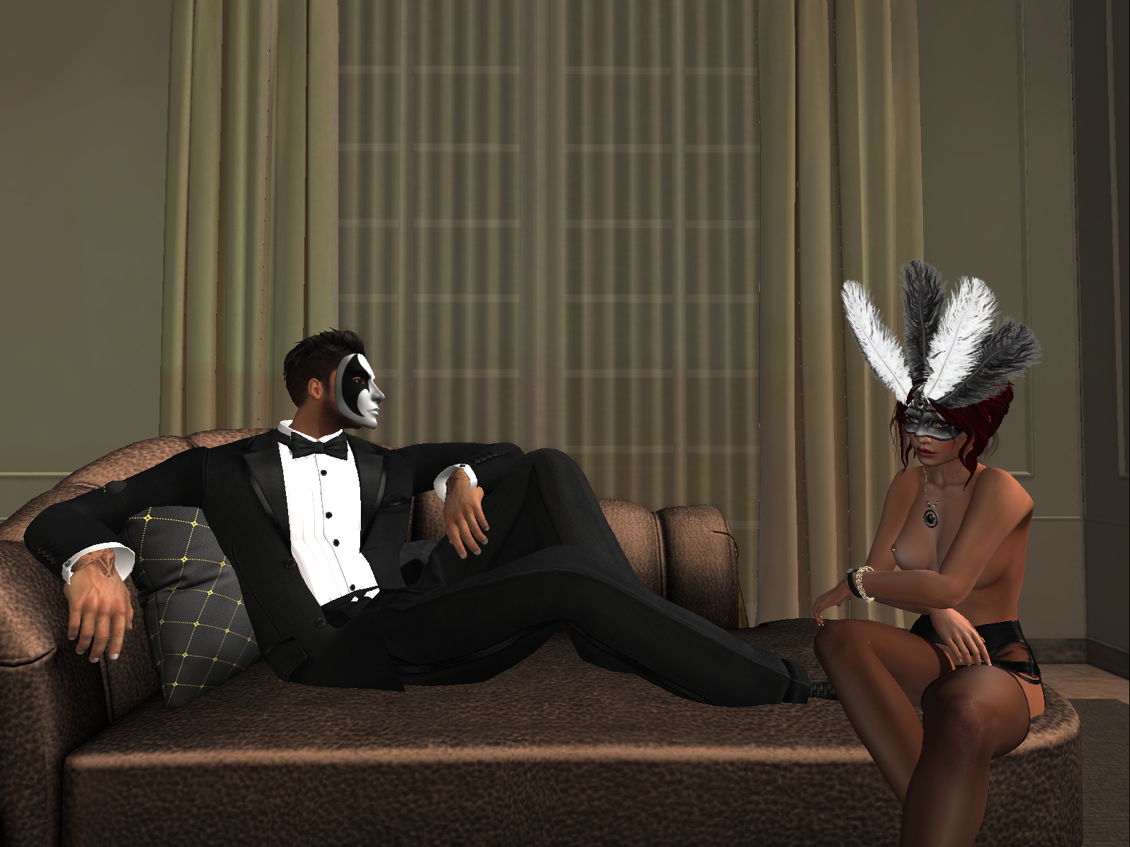 First thing I wanted to do is to work a little on an appropriate outfit. There is not much to wear, but the dress code allows a cloak and I wanted to wear a more eccentric mask. After some investigations on the marketplace, I finally found what I was looking for (well kind of, I am not fully satisfied with the cloak yet). So I dressed up with my heels, a pair of stockings, a thong and suspenders, and of course the cloak and my brand new feather mask … I was ready.